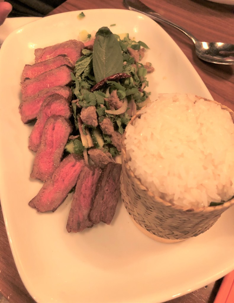 The Server guided us when ordering the entrees because the spice level is not indicated on the menu and my husband does not like any hot spice. He ordered the Steak Laab which is the only item on the menu that is not spicy. He also ordered a side of sticky rice (rice is not included). He said that the steak was good, but very small and he left still a bit hungry.