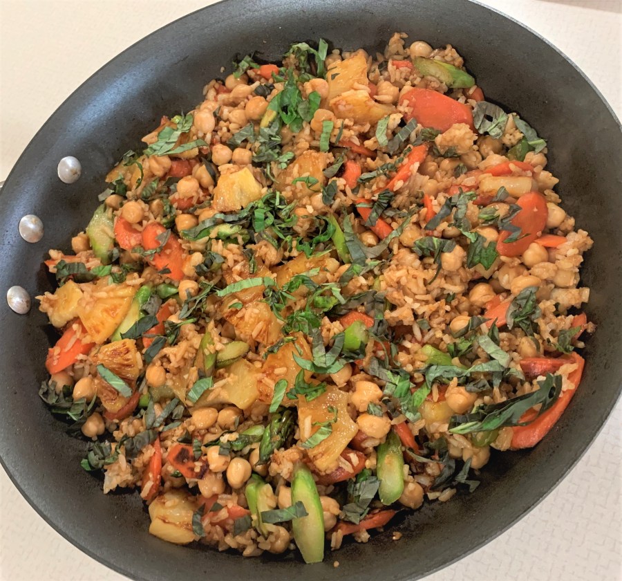 Heat another teaspoon of oil to the skillet and add the carrots along with a couple tablespoons of water. Cover the skillet and occasionally stir until almost tender- about 4 minutes. Add the asparagus and cover again for several minutes until both carrots and asparagus are tender. The water should have evaporated; remove the lid and sauté if some water remains. Add garlic and ginger stirring until fragrant. Add rice, beans, peas and soy sauce stirring frequently so rice does not stick. If rice is sticking to the bottom of the pan, lower heat and cover. Wait 1-2 minutes and rice should come off the bottom of the pan. When heated through, stir in basil or cilantro and pineapple. Remove from heat and squeeze the lemon or lime over the top. Serve.