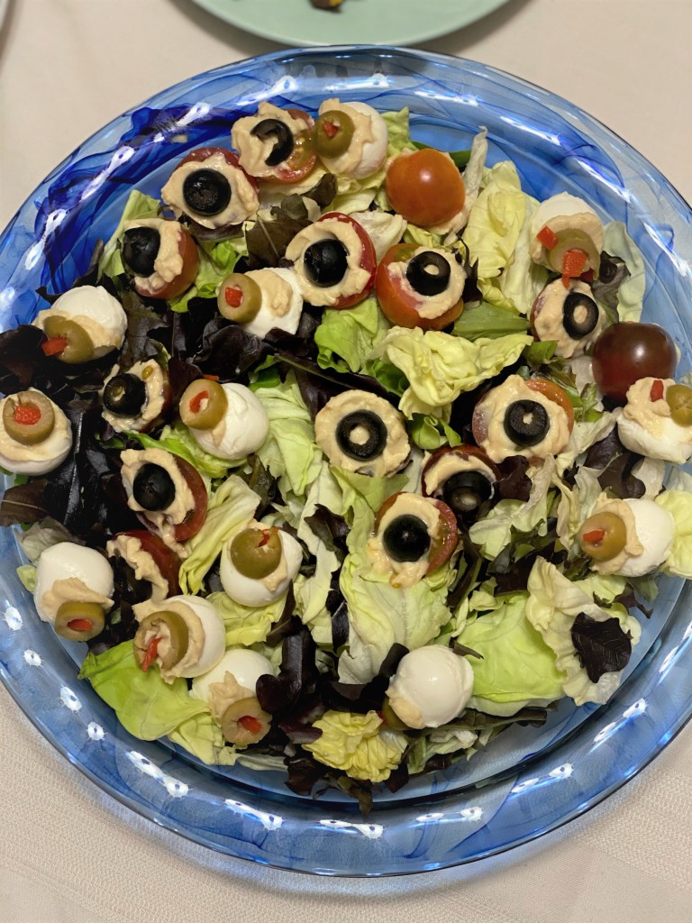 The Spooky Salad recipe was found on the Food Network Website from the Patricia Heaton’ s show- www.foodnetwork.com/recipes/patricia-heaton/spooky . I actually enjoyed the dressing; it was nice and tangy. I skipped the “fingers” or baby carrots because I ran out of time and fingers were part of the main course.