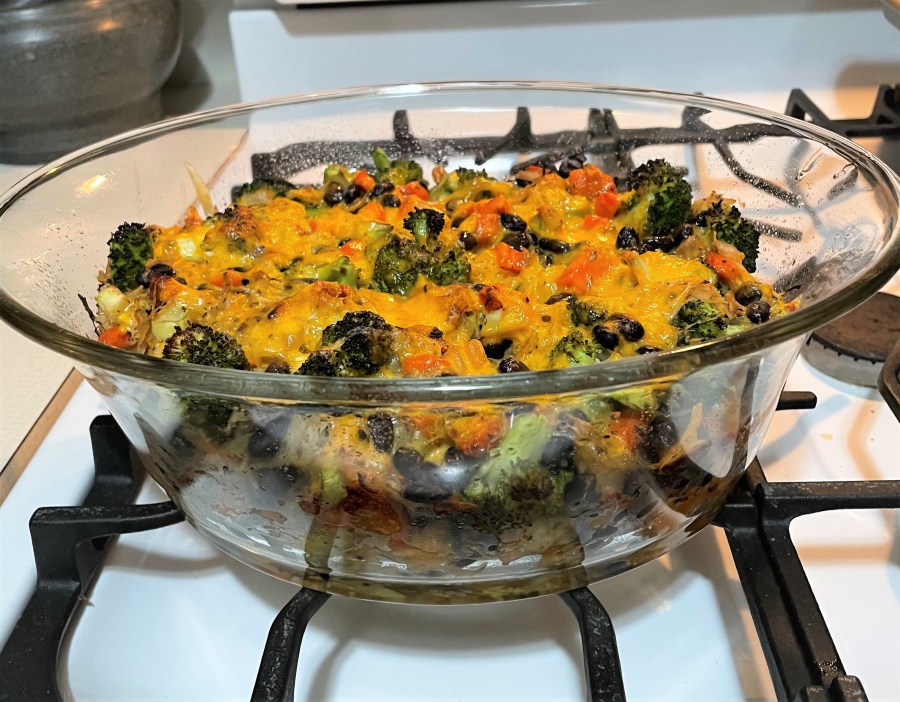 With a fork separate squash strands and set aside. When the carrots and broccoli are almost tender, add squash strands, beans, thyme, sage, salt and pepper to onion mix along with 1 cup of the shredded cheese. Toss to mix