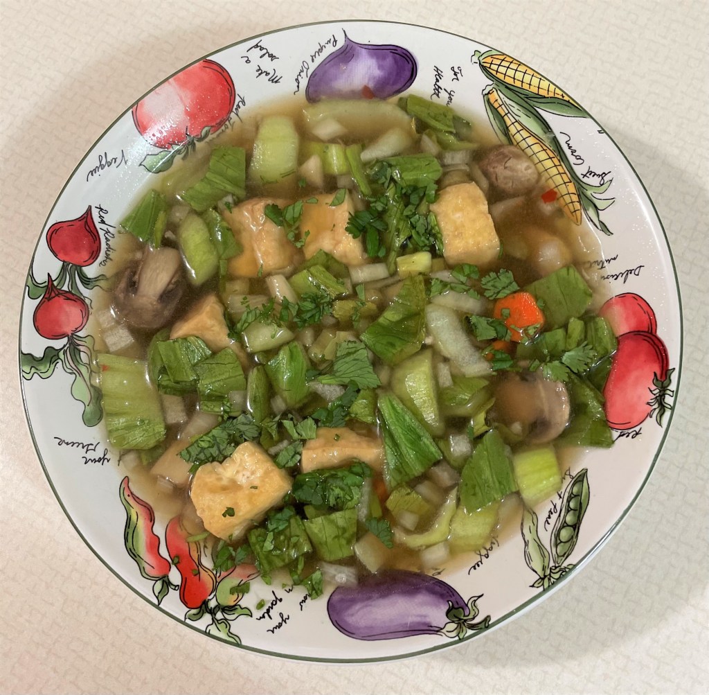 Chop bok choy in bite size pieces or slice in half and then add to soup along with the soy sauce. Cook for 10-15 minutes or until the bok choy is barely tender, but still has some bite. Serve immediately.