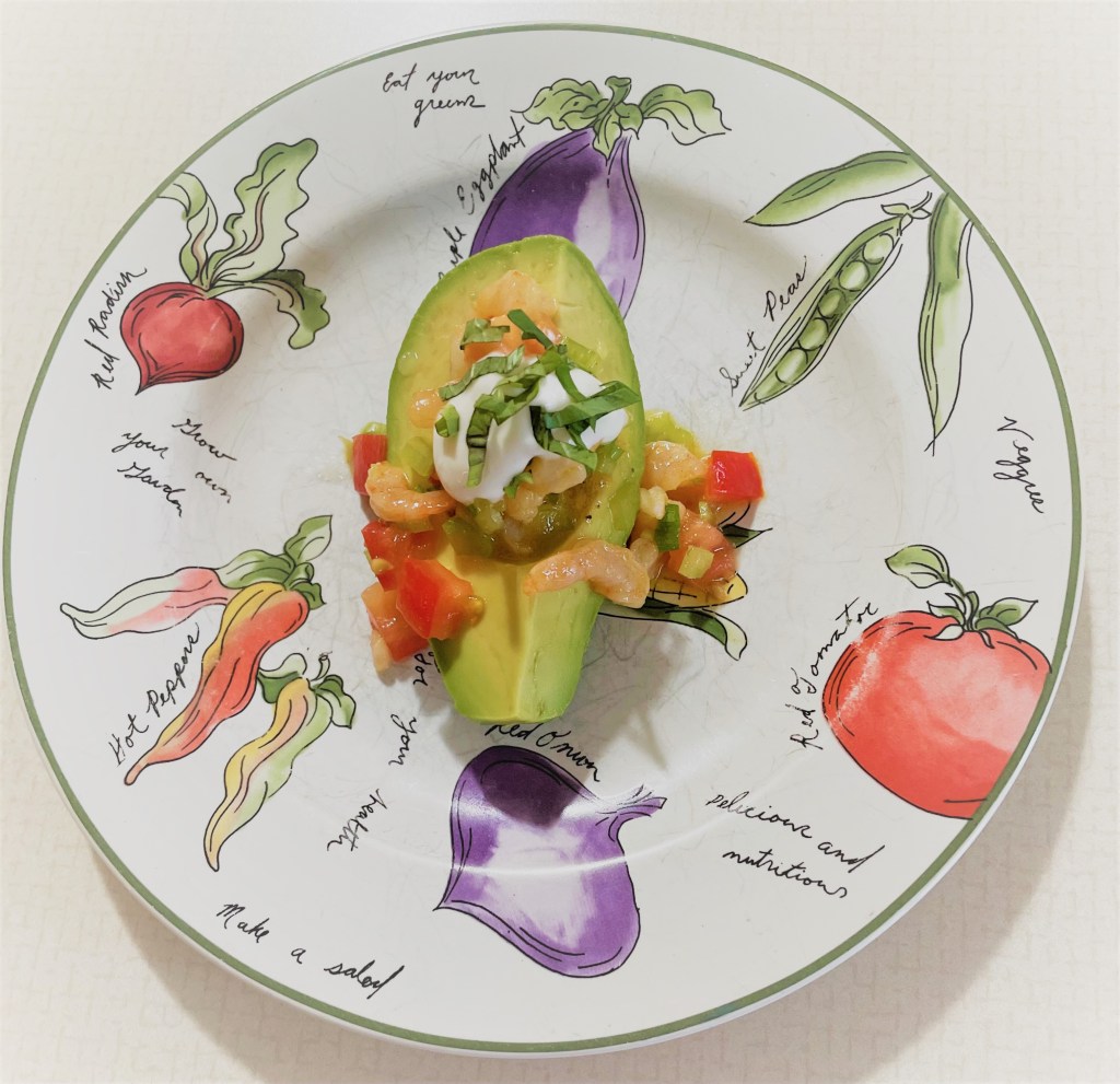 Mix together olive oil, mustard and vinegar. Add the salt and pepper, shrimp or crab, tomato, onion and celery. Toss well. Dip the avocado halves in the lemon juice. Fill the avocado halves with the shrimp mixture. They can be served with a dollop of mayonnaise or plain yogurt and garnish with fresh herbs or chives. Very yummy!
