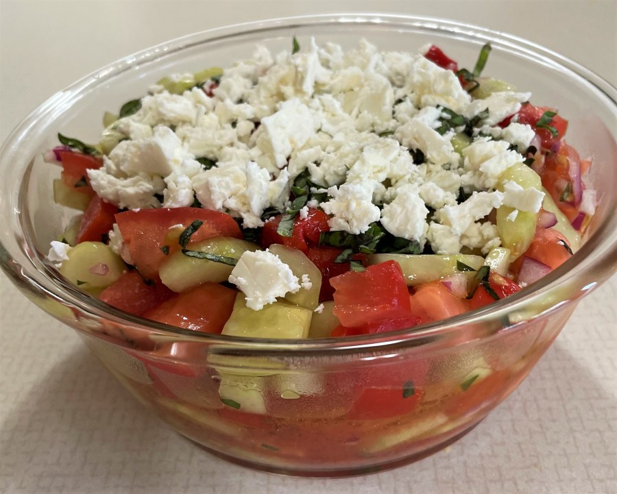 Salt, oil and vinegar to taste – 3 parts oil to 1 part vinegar (I started with 2 T oil and 1/2 T vinegar because the tomatoes and cucumber are very watery)