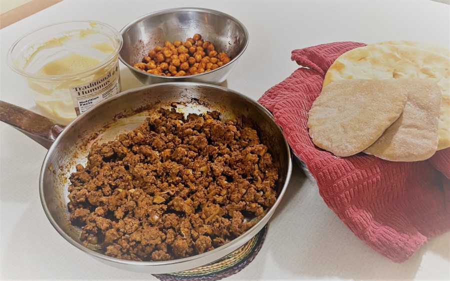 The Crispy Chickpeas are wonderfully seasoned, but I couldn’t bring myself to use 1/4 cup of oil the recipe listed. I used about 2 tablespoons instead and they turned out fine and tasted good. The spiced beef came together very easily and was also good. Together they made a very nice topping for the hummus and bread. The downside to this recipe is that it does not make good leftovers. It just didn’t have the same textures or taste when warmed up.