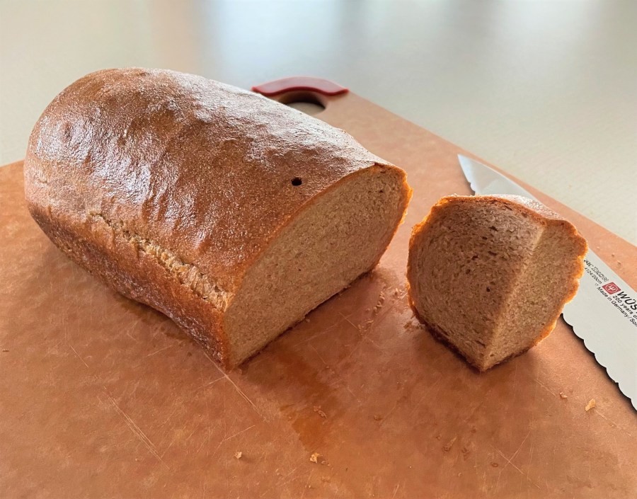 Bake in a preheated 4000F oven for 40- 45 minutes. If it sounds hollow it’s done or the temperature should be around 2000F. Remove it from the pan and let it cool on a rack. I spread some butter over the top when it came out of the oven and it was very nice. Bread is perfect with bean or legume dishes- yum!