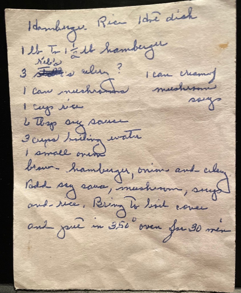 Ok, so this dish may not look very appetizing, but it is very special to me. My Mom was the queen of the “Hot Dish” and we grew up on them. This particular hot dish was written out for me by my Mom. Another cherished recipe because it is in her handwriting. Her handwriting is very unique. Wouldn’t you agree?