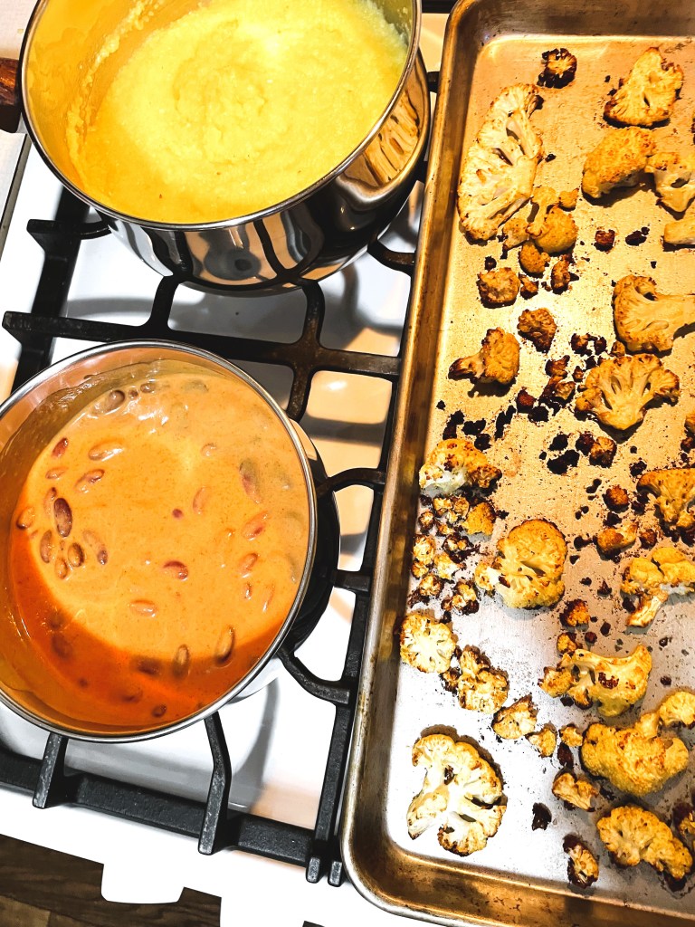 Spread polenta on the plate and top with the kidney beans. The cauliflower can be on the side or placed on top. I was in food heaven eating these favorites together!
